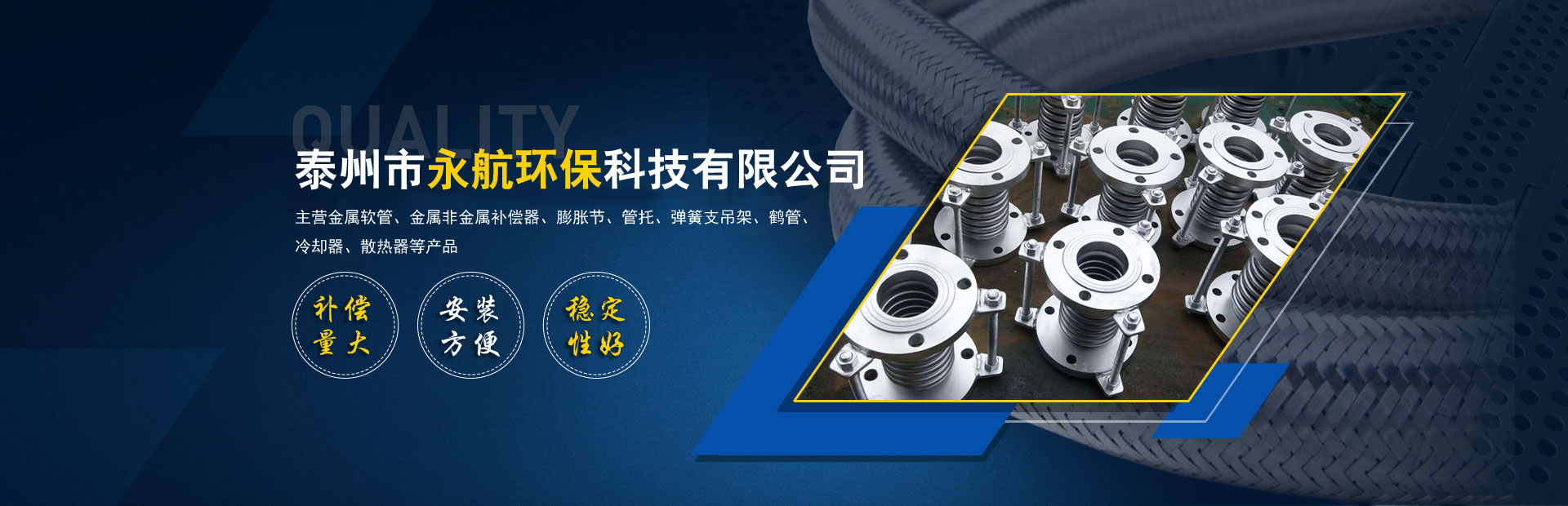 公司專注從事設(shè)計制造金屬膨脹節(jié)、不銹鋼金屬軟管、波紋管補償器、不銹鋼軟管、不銹鋼波形波紋補償器、矩形補償器、非金屬補償器、冷卻器、換熱器、風(fēng)門、法蘭、管件、墊片、橡膠補償接管、減振器、減振墊和各類高壓軟管產(chǎn)品。